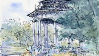 日々の風景 鶴舞公園奏楽堂 雨上がりの大気を纏いながら水色のクーポラを戴いた姿はイ短調とイ長調を移ろう様に何処か愉しそうに映りましたこの後ジャンルレスアート展へと矢場町までぶらり歩いてみました地図で見るのと実際歩くのとでは距離の感覚が大違いで大変でしたsize:A4 ... 2025.10.03 日々の風景絵画
