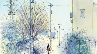 日々の風景 北八王子の無人直売所 覆いの荒れた無人直売所とスコア譜面のような高圧線こういう何事もない風景に惹かれて描きたくなりますsize:A4 画用紙 油性ペン・水彩ヴィフアール水彩紙(中目) 2026.02.06 日々の風景絵画