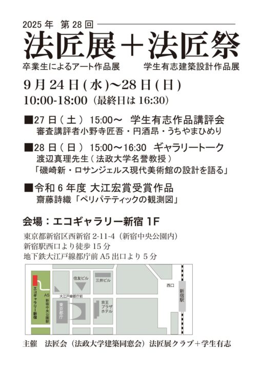 毎年9月下旬に新宿中央公園内のエコギャラリー新宿にて開催されている法政大学建築同窓会主催のグループ展「法匠展+法匠祭」に出展します。お時間ありましたら、ぜひご覧ください!