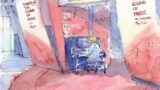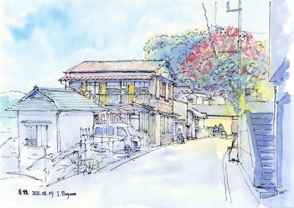 真鶴百景(87) 2025.09.17 西の道祖神がいる道 道の先に道祖神がふたり優しく穏やかに微笑んで並んで座って待ってます通る度にホッとしますがその尊顔を描くにはまだ画力が無いので遠くから size:A4 画用紙 油性ペン・水彩 ヴィフアール水彩紙(中目)