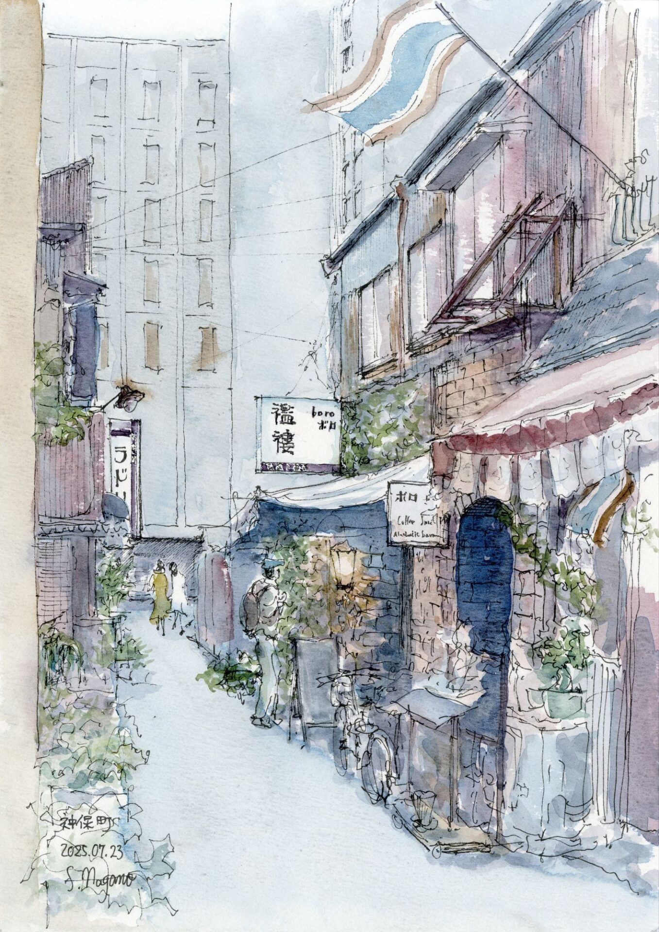 神保町 黄昏時の路地裏 2025.08.25 昼食に偶々寄った路地裏の空気感が忘れ難く別の日の所用のついでに再び訪ねてみました 着彩は新しく購入した絵具を試してみたくてホルベインのナイトフォールカラーのみです size:A4 画用紙 耐水ペン・水彩 ヴィフアール水彩紙(中目)