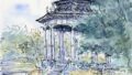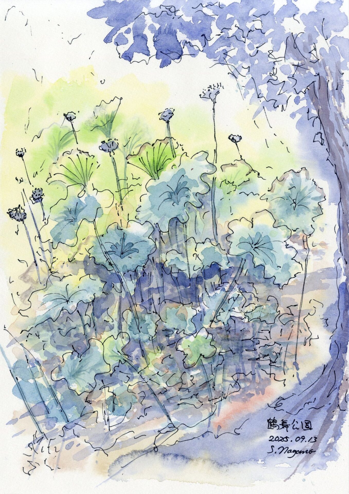 鶴舞公園の蓮 2025.09.29 鶴舞駅で途中下車して公園散策名古屋工大の学生展示を拝見しようやく雨も上がりそうなころ蓮池の朽ちはじめた葉を陽光がとても美しく照らしていました size:A4 画用紙 油性ペン・水彩 ヴィフアール水彩紙(中目)