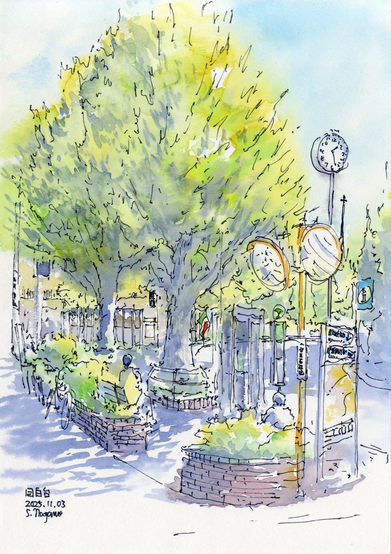 陽だまりのバス停 2025.11.07 目白台の家おうちひらきにお伺いし帰りのバスを待ちつつペンスケッチ分かれ道に挟まれたちいさな緑地の程よい囲み感とスケールが心地良くほっと佇むことのできる都市の片隅肌を刺す木枯らしが吹き荒れつつも陽だまりが心地よい昼下がりでした size:A4 画用紙 油性ペン・水彩 ヴィフアール水彩紙(中目)