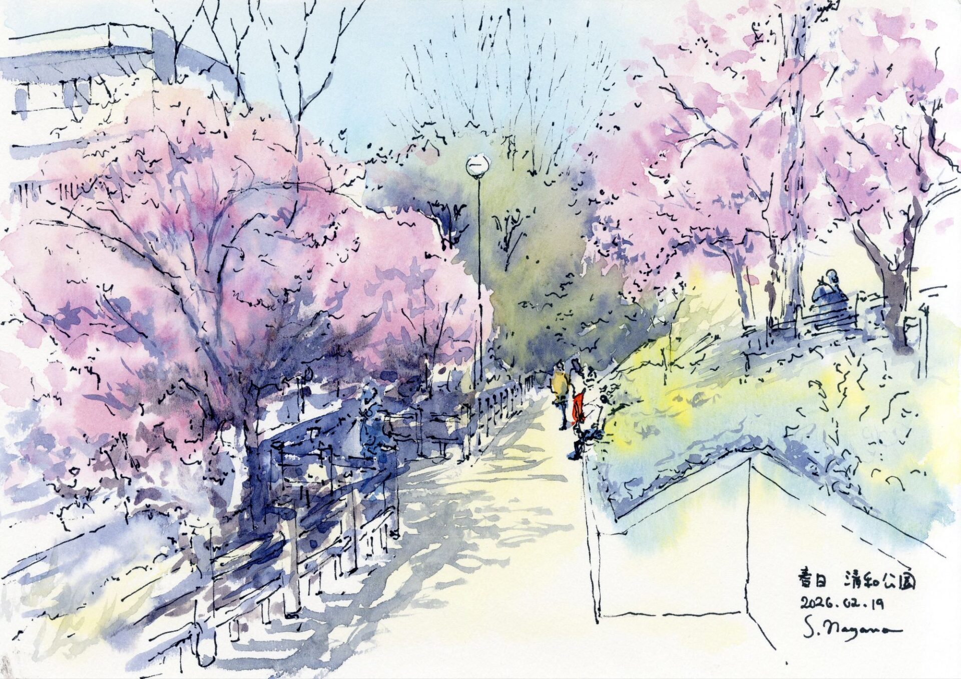 春日 清和公園の河津桜 2026.03.13 ビルの間から一瞬だけ見えた薄紅色に誘われて清和公園へ図らずも河津桜が満開でした斜面の中腹に座れる所があり都会のお昼時のオアシスですくぼみのベンチに腰掛けると桜の樹の上に居るような感覚地形を活かした居心地良さとスケール感が気に入ってます size:A4 画用紙 油性ペン・水彩 ヴィフアール水彩紙(中目)