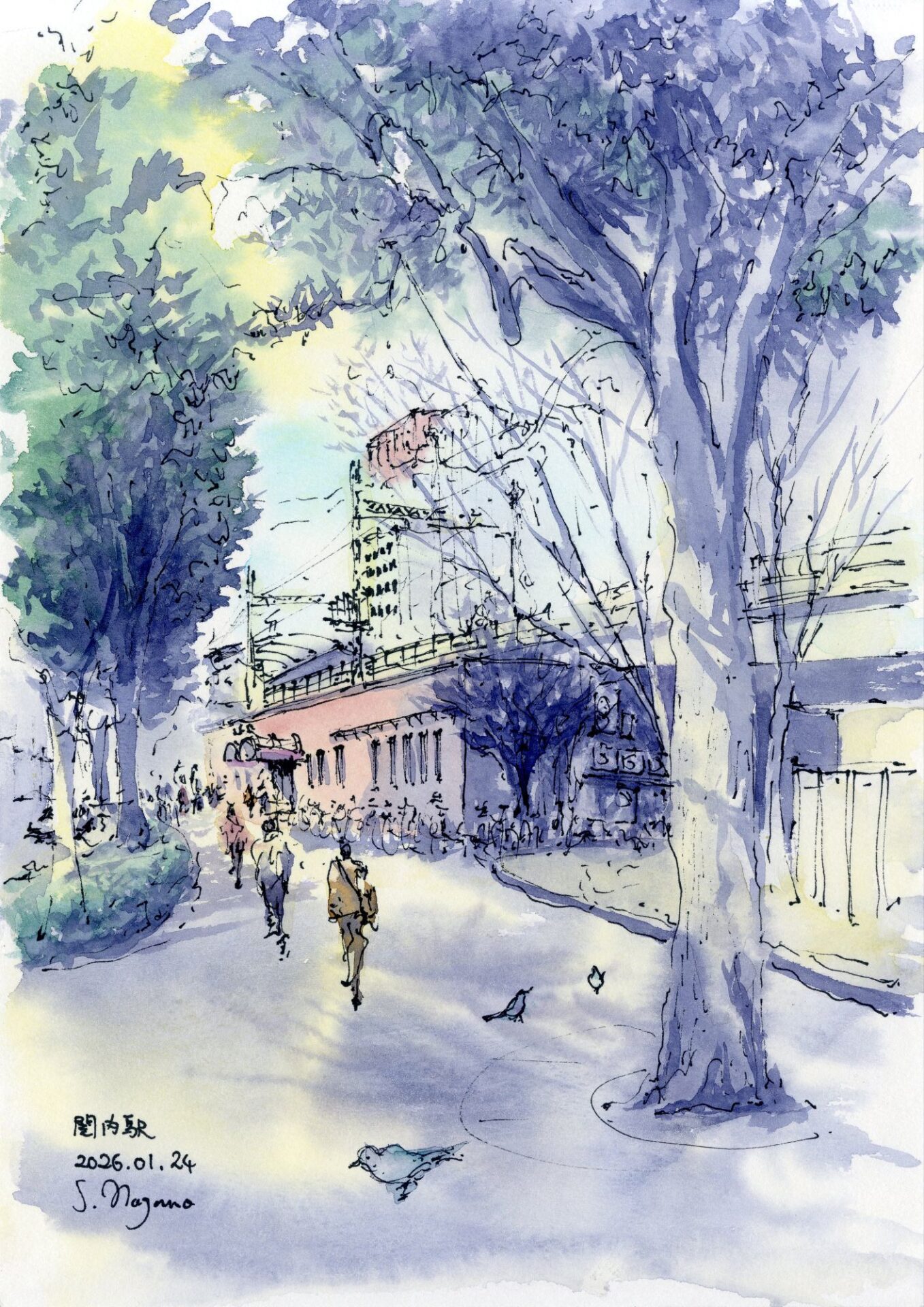 ペンを使わずスケッチを一枚帰りのバスから見えた風景を記憶を頼りに描いてみましたでんしんばしらの行進の先に鮮やかな紫色に染まる富士が目に焼き付いてしまいましたsize:B5 画用紙 水彩ヴィフアール水彩紙(荒目)