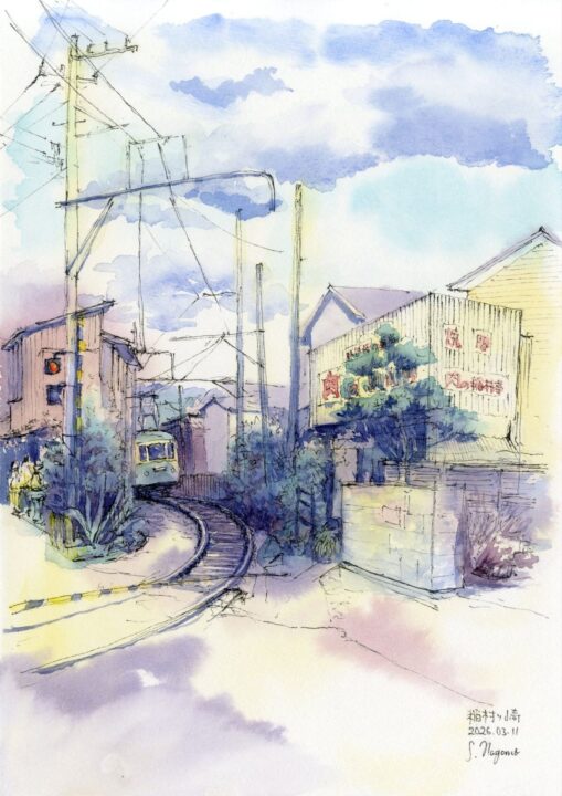 夕暮れの江ノ電と肉の稲村亭 2026.04.16 少しあいた夕方の時間に由もなく海を見たくなり江ノ電に乗り稲村ヶ崎へ動いてる電車を描くのはなかなか苦手なのですがちょうど踏切手前の所で江ノ電が減速してくれて加えることができました size:A4 画用紙 耐水ペン・水彩 ヴィフアール水彩紙(中目)